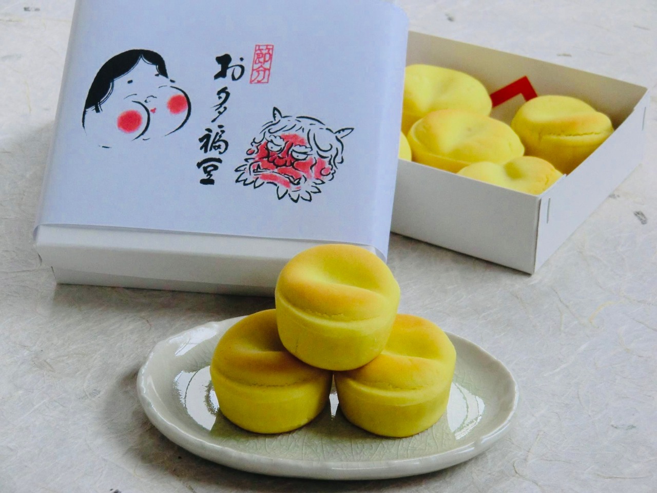 お多福豆は、こし餡を包みしっとりと焼き上げた桃山製のお菓子でございます。